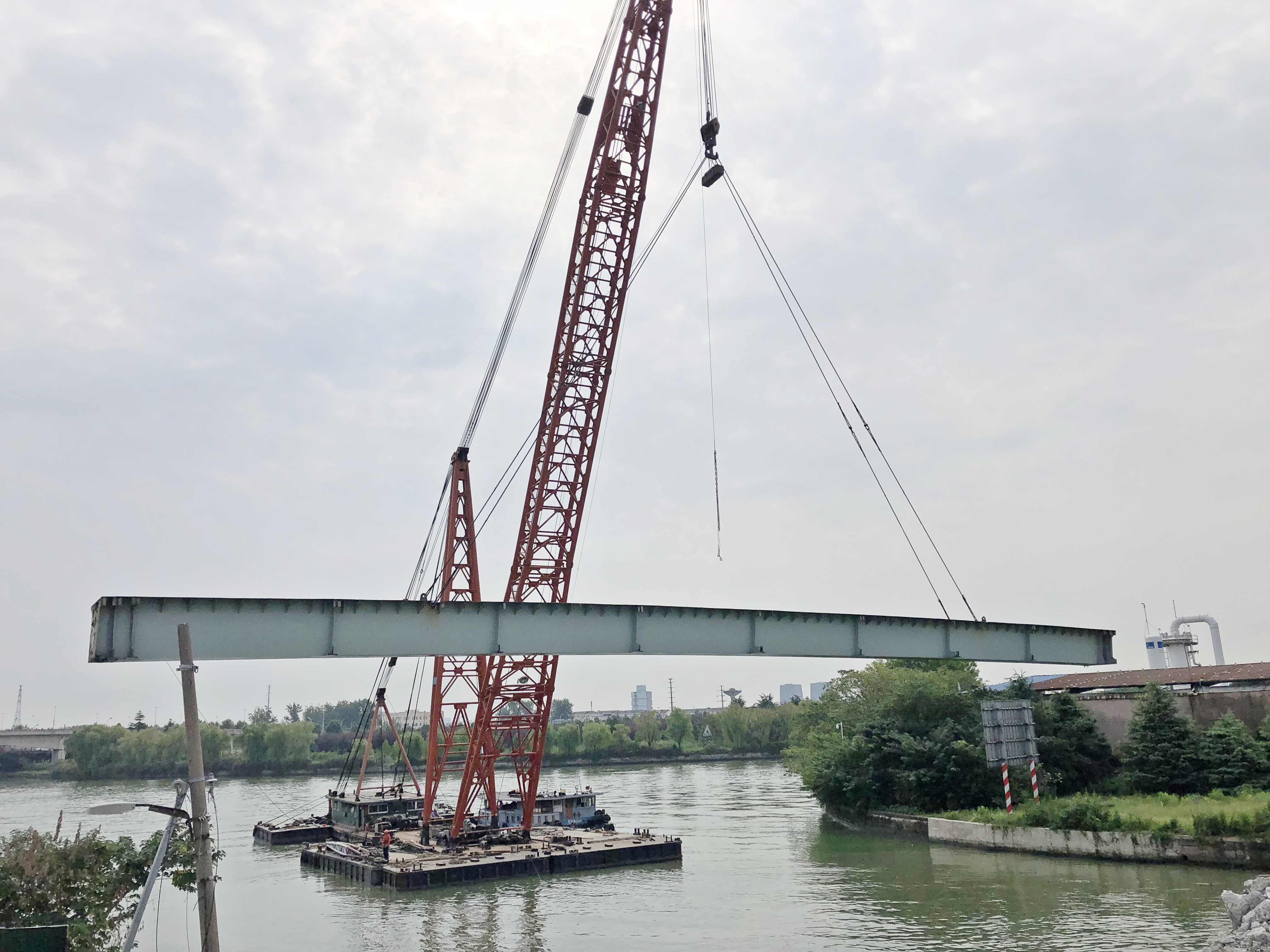 万成公司参建的娄江河项目,其中包括一座钢结构桥梁的拆除工程。该桥梁跨径为13m+50m+13m,桥宽8 米,中跨为钢结构箱梁,梁高1.8米,钢箱梁分3个单箱,每个单箱的吊装重量约69吨。起重量超过300KN,属于危险性较大的分部分项工程,且为水上作业,如何安全、高效、稳妥拆除非常重要。公司生产技术条线极为重视,精细过程管控;项目部组织协调更是严谨务实,保证了这一任务圆满完成。