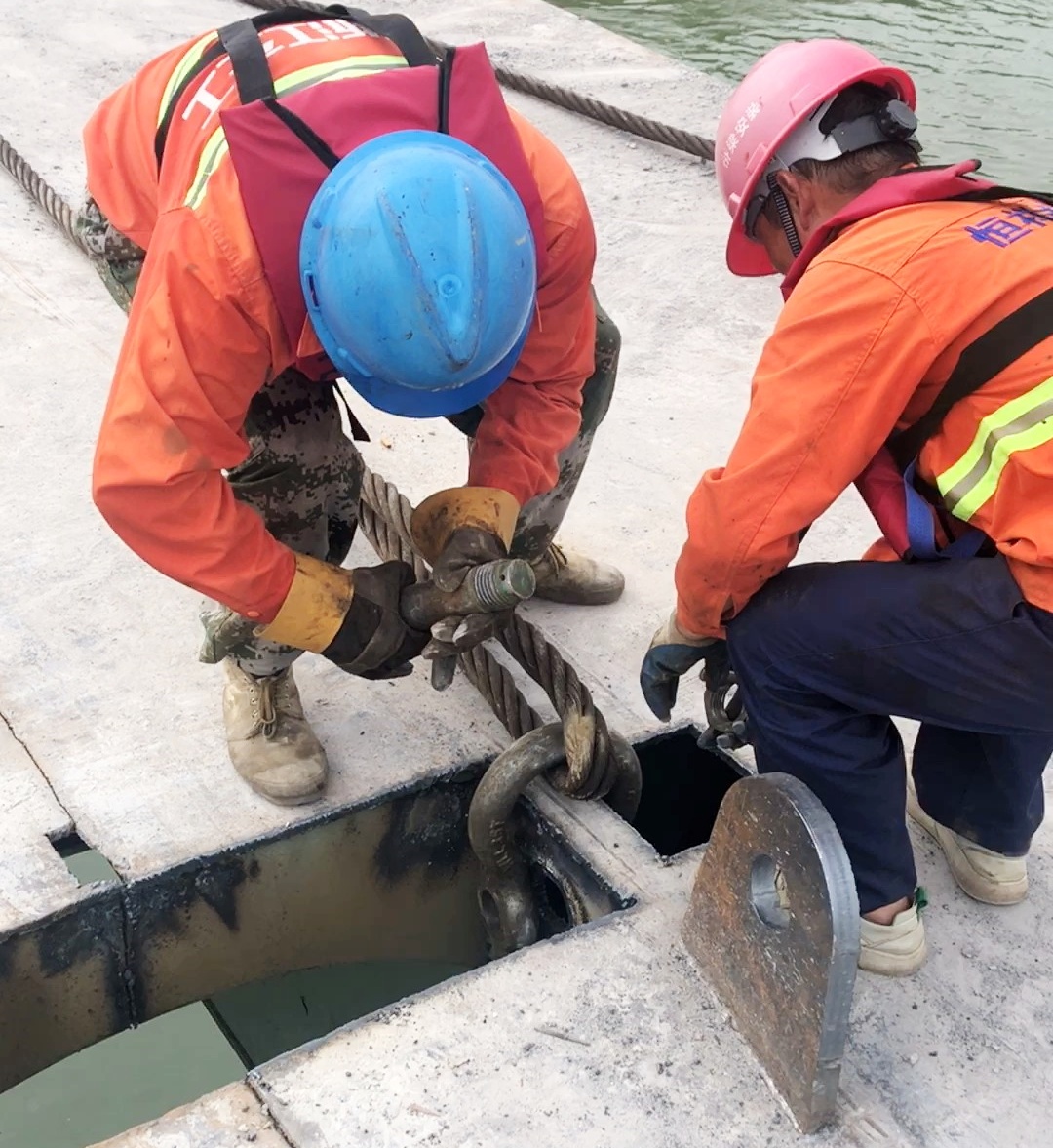 (3)安全文明管控:作业现场围挡封闭,出入口专职安保人员值勤;所有进场施工人员接受安全交底,特殊作业人员持证上岗;河道临时封航,上下游150米处分别设警戒线,航道部门专人值守。