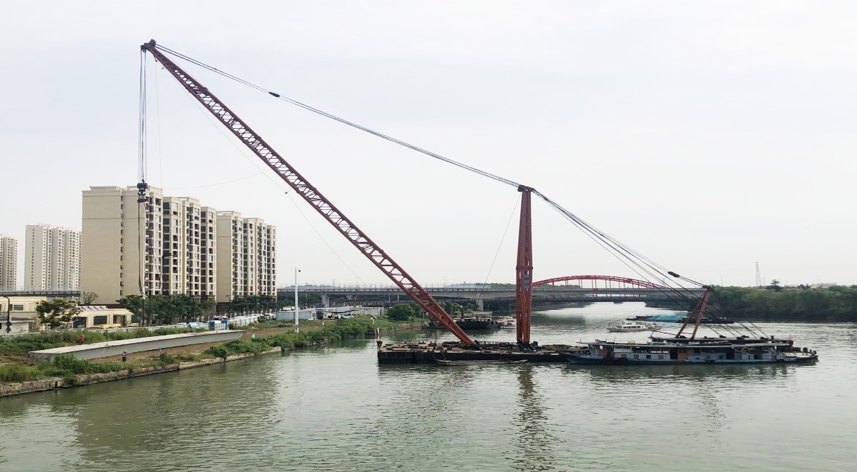 依据住建部《危险性较大的分部分项工程安全管理规定》、《江苏省房屋建筑和市政基础设施工程危险性较大的分部分项工程安全管理实施细则》等文件规定,项目部组织编制桥梁拆除专项施工方案。项目技术人员与公司总工等条线负责人,对“汽车吊岸上吊拆方案”、“水上浮吊船吊拆方案”进行方案比选,从技术可行性、经济合理性、安全可靠性、机械化程度、对航道影响多维度多次进行深入讨论,并进行专家论证,最终选择安全性更高的水上浮吊船吊拆方案。