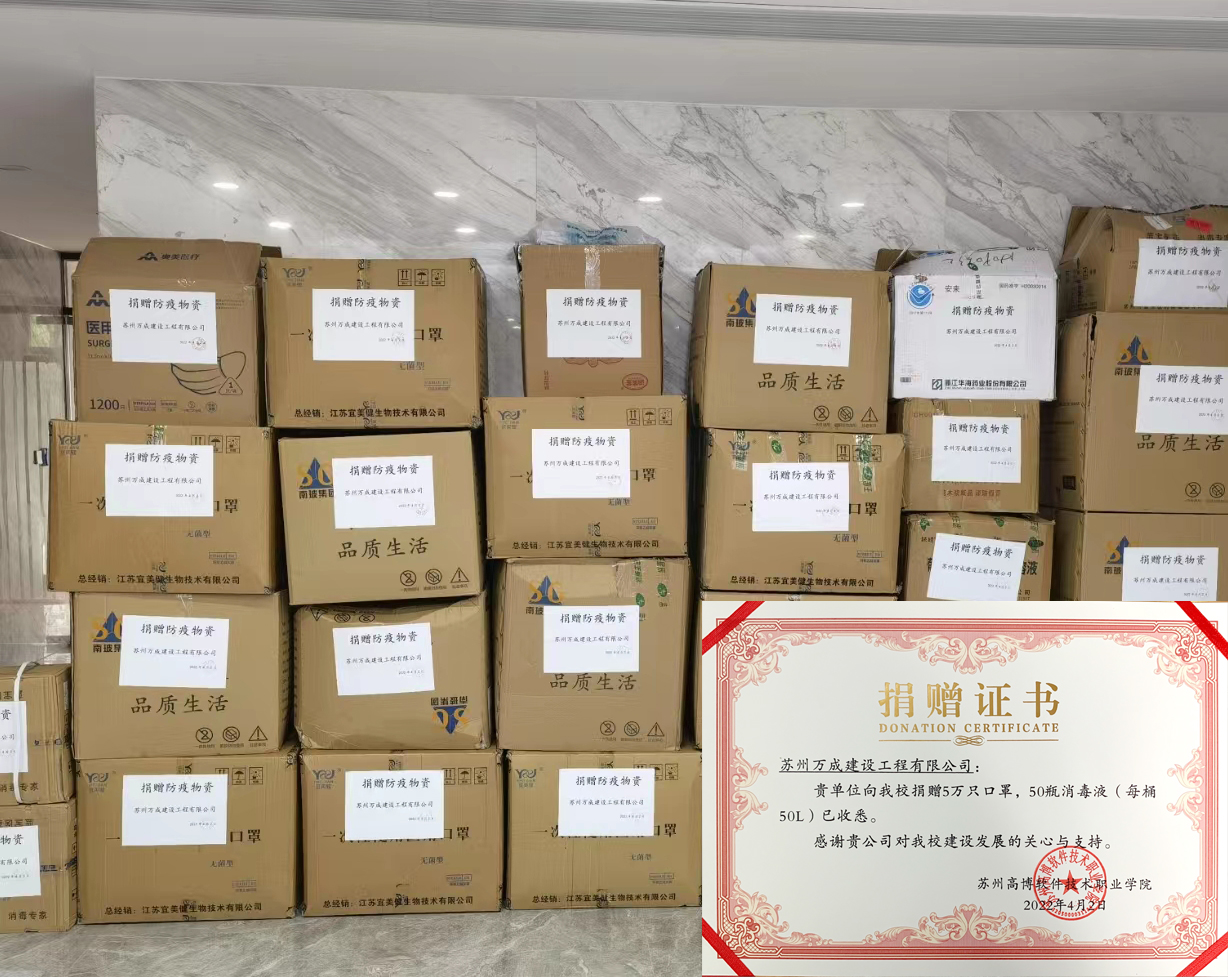 坚定信心,共克时艰。苏州万成建设工程有限公司想方设法采购口罩、消毒液等防疫物资,关心支持苏州高博软件技术职业学院防疫抗疫,献出企业的一份爱心。