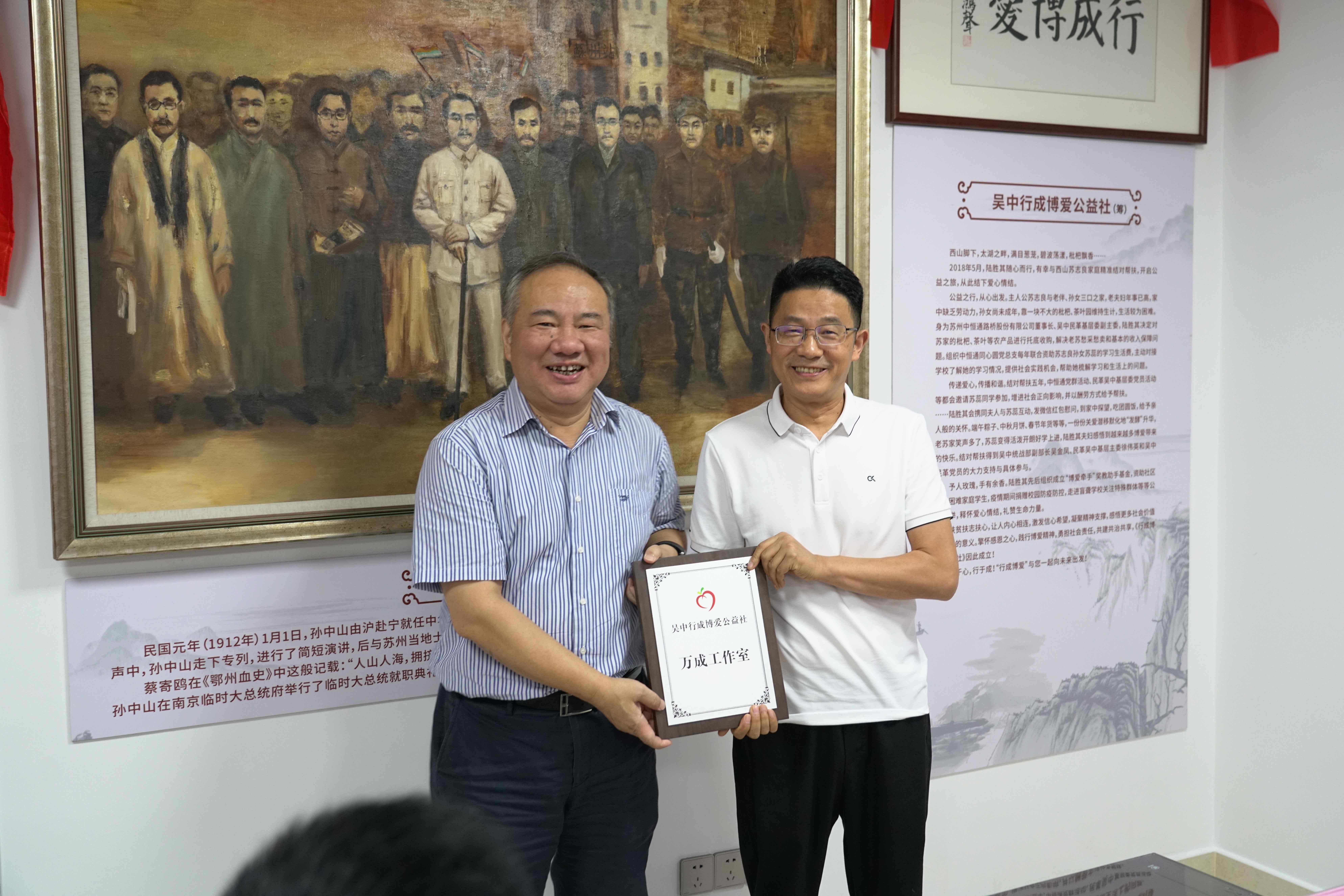 万成公司董事长朱守友接受王鸿声为“同心缘行成博爱公益社万成工作室”的授牌。